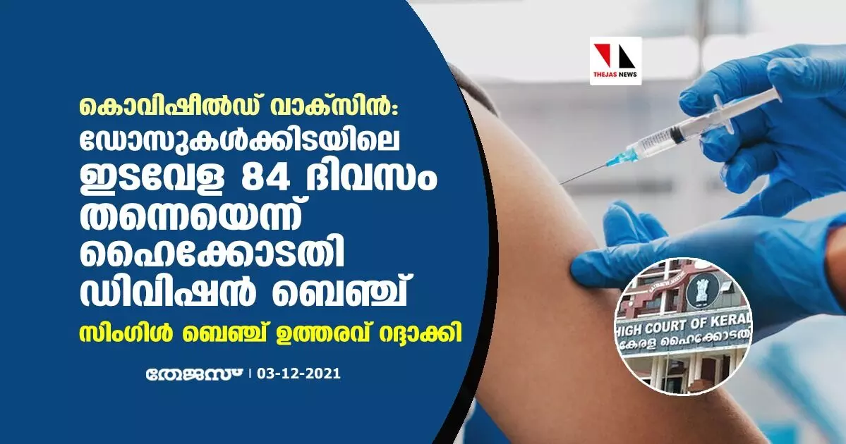കൊവിഷീല്ഡ് വാക്സിന്:ഡോസുകള്ക്കിടയിലെ ഇടവേള 84 ദിവസം തന്നെയെന്ന് ഹൈക്കോടതി ഡിവിഷന് ബെഞ്ച്;സിംഗിള് ബെഞ്ച് ഉത്തരവ് റദ്ദാക്കി