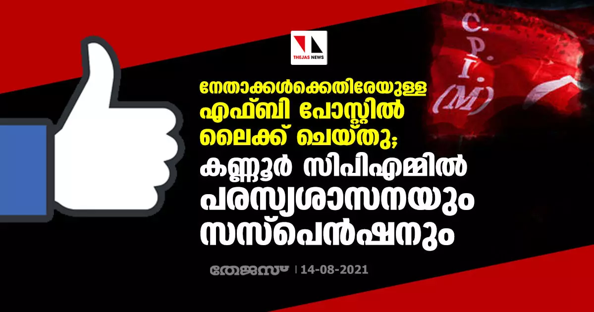 നേതാക്കൾക്കെതിരേയുള്ള എഫ്ബി പോസ്റ്റിൽ ലൈക്ക് ചെയ്തു; കണ്ണൂർ സിപിഎമ്മിൽ പരസ്യശാസനയും സസ്പെൻഷനും