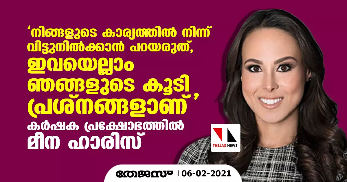 തന്നെ നിശ്ശബ്ദയാക്കാമെന്ന് കരുതേണ്ടെന്നും കര്ഷകരെ ഇനിയും പിന്തുണയ്ക്കുമെന്നും മീന ഹാരിസ് നേരത്തെ വ്യക്തമാക്കിയിരുന്നു. കര്ഷക പ്രതിഷേധവുമായി ബന്ധപ്പെട്ട 'വിദേശ' ട്വീറ്റുകളില് ഇന്ത്യയില് ഉയര്ന്ന വിവാദങ്ങളോടാണ് മീനയുടെ പ്രതികരണം.