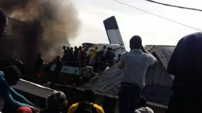നോര്ത്ത് കിവുവില് നിന്ന് 350 കിലോമീറ്റര് അകലെയുള്ള ഗോമയിലെ ബേനിയിലേക്ക് പോവുകയായിരുന്ന സ്വകാര്യ വിമാനക്കമ്പനിയായ ബസി ബീയുടെ ഉടമസ്ഥതയിലുള്ള ഡോര്ണിയര് 228 ഇരട്ട എഞ്ചിന് വിമാനം പറന്നുയര്ന്ന് മിനിറ്റുകള്ക്കകം തകര്ന്നുവീഴുകയായിരുന്നുവെന്ന് ഗോമ വിമാനത്താവള വൃത്തങ്ങള് അറിയിച്ചു. അപകട കാരണം ഇപ്പോഴും വ്യക്തമല്ല. എന്നാല് വിമാനം പറന്നുയര്ന്നയുടനെ വിമാനം എഞ്ചിന് തകരാറിലായതായി വിമാനത്താവള വൃത്തങ്ങള് അറിയിച്ചു.ചില വൃത്തങ്ങള് അറിയിച്ചു. പരിക്കേറ്റവരെ പുറത്തെത്തിക്കാനും മൃതദേഹങ്ങള് കണ്ടെടുക്കാനും രക്ഷാപ്രവര്ത്തകരും പ്രദേശവാസികളും അപകടസ്ഥലത്ത് എത്തിയിട്ടുണ്ട്. അപകട സമയം എത്ര പേര് വീടുകളില് ഉണ്ടായിരുന്നുവെന്ന് വ്യക്തമല്ല.കോംഗോയില് അടുത്ത കാലത്തായി വിമാനങ്ങള് അപകടത്തില്പെടുന്ന സംഭവങ്ങള് വര്ധിച്ചിട്ടുണ്ട്. നിലവാരമില്ലാത്ത വിമാനങ്ങളും സുരക്ഷാ ക്രമീകരണങ്ങളുടെ കുറവുമാണ് പലപ്പോഴും അപകടങ്ങള്ക്ക് കാരണമായി ചൂണ്ടിക്കാണിക്കപ്പെടുന്നു.വിമാന കമ്പനിയായ ബിസി ബീ സംഭവത്തില് പ്രതികരിച്ചിട്ടില്ല. ബിസി ബീ ഉള്പ്പെടെയുള്ള കോംഗോ വിമാന കമ്പനികള്ക്ക് യൂറോപ്യന് യൂണിയന് പ്രവര്ത്തന വിലക്ക് ഏര്പ്പെടുത്തിയിരുന്നു.