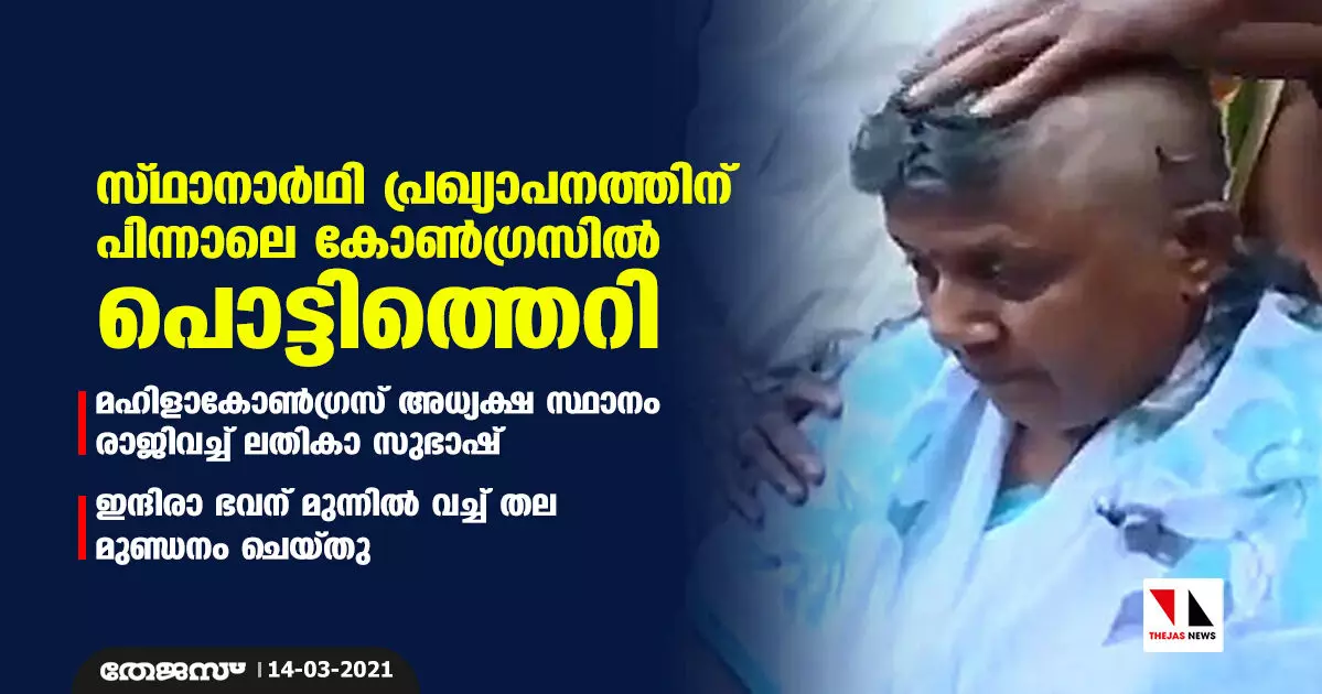 സ്ഥാനാര്ഥി പ്രഖ്യാപനത്തിന് പിന്നാലെ കോണ്ഗ്രസില് പൊട്ടിത്തെറി; മഹിളാകോണ്ഗ്രസ് അധ്യക്ഷ സ്ഥാനം രാജിവച്ച് ലതികാ സുഭാഷ്, തല മുണ്ഡനം ചെയ്തു
