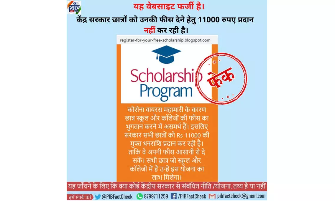 ന്യൂഡല്ഹി: വിദ്യാര്ഥികള്ക്ക് ഫീസ് അടയ്ക്കാന് കേന്ദ്രസര്ക്കാര് 11,000 രൂപ നല്കുമെന്ന് അവകാശപ്പെട്ട് സാമൂഹിക മാധ്യമങ്ങളില് പ്രചരിക്കുന്നത് വ്യാജപ്രചാരമാണെന്നു പ്രസ് ഇന്ഫര്മേഷന് ബ്യൂറോ (പിഎന്ബി) വ്യക്തമാക്കി. കൊവിഡ് കാരണം നിരവധി വിദ്യാര്ത്ഥികള്ക്ക് സ്കൂള്, കോളജ് ഫീസ് അടയ്ക്കാന് കഴിയാത്തതിനാലാണ് കേന്ദ്ര സര്ക്കാര് ഇത്തരത്തില് സ്കോളര്ഷിപ്പ് നല്കുന്നതെന്നായിരുന്നു സാമൂഹിക മാധ്യമങ്ങളിലൂടെ പ്രചരിപ്പിക്കുന്നത്. ഇത്തരത്തിലുള്ള പ്രചാരണം നടത്തുന്ന വെബ്സൈറ്റ് വ്യാജമാണെന്നും അത്തരമൊരു പ്രഖ്യാപനം കേന്ദ്രസര്ക്കാര് അറിയിച്ചിട്ടില്ലെന്നും പിഎന്ബി അറിയിച്ചു. യഥാര്ത്ഥ സ്കോളര്ഷിപ്പുകള്ക്കായി, കൃത്യവും ആധികാരികവുമായ വിവരങ്ങള് ലഭിക്കാന് വിദ്യാര്ത്ഥികള്ക്ക് ദേശീയ സ്കോളര്ഷിപ്പ് പോര്ട്ടലില് scholars.gov.inല് രജിസ്റ്റര് ചെയ്യാം.