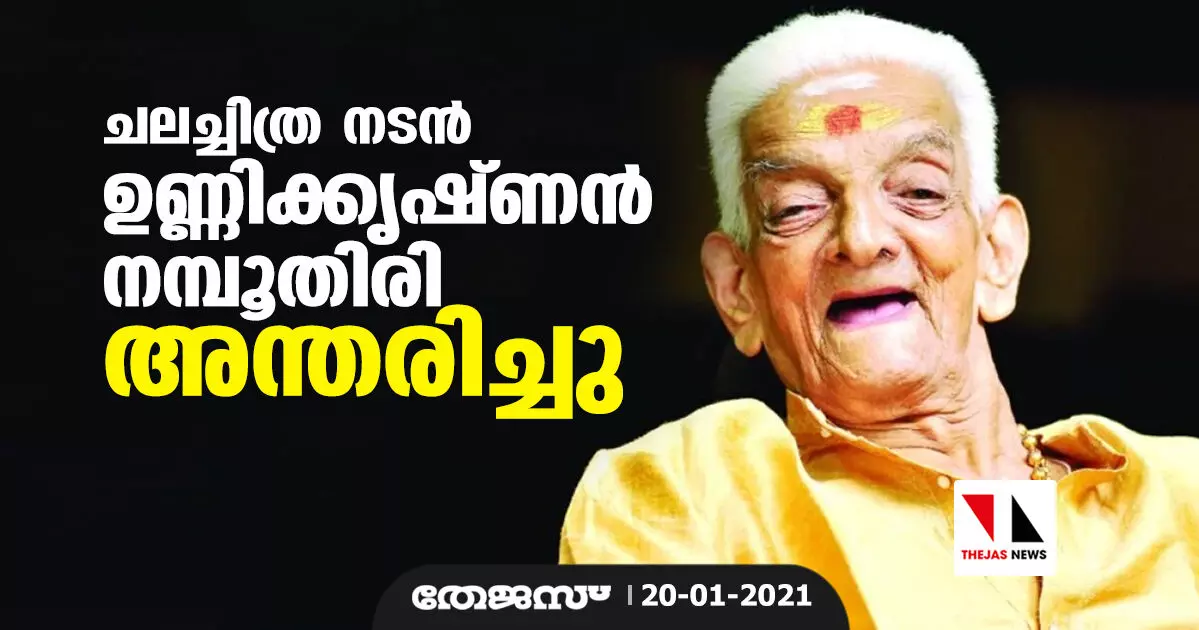 കണ്ണൂര്: ചലച്ചിത്ര നടന് പയ്യന്നൂരിനു സമീപം പുല്ലേരി വാധ്യാരില്ലത്ത് ഉണ്ണിക്കൃഷ്ണന് നമ്പൂതിരി അന്തരിച്ചു. 98 വയസ്സായിരുന്നു. ദേശാടനം, കല്യാണരാമന്, ചന്ദ്രമുഖി, പമ്മല് കെ. സംബന്ധം തുടങ്ങിയ സിനിമകളില് പ്രധാന വേഷം ധരിച്ചിട്ടുണ്ട്. കൊവിഡ് ബാധിച്ച് ചികില്സയിലായിരുന്നെങ്കിലും കഴിഞ്ഞ ദിവസം നെഗറ്റീവായിരുന്നു. കണ്ണൂരില് വച്ചായിരുന്നു അന്ത്യം. കൈതപ്രം ദാമോദരന് നമ്പൂതിരിയുടെ ഭാര്യാപിതാവാണ്.