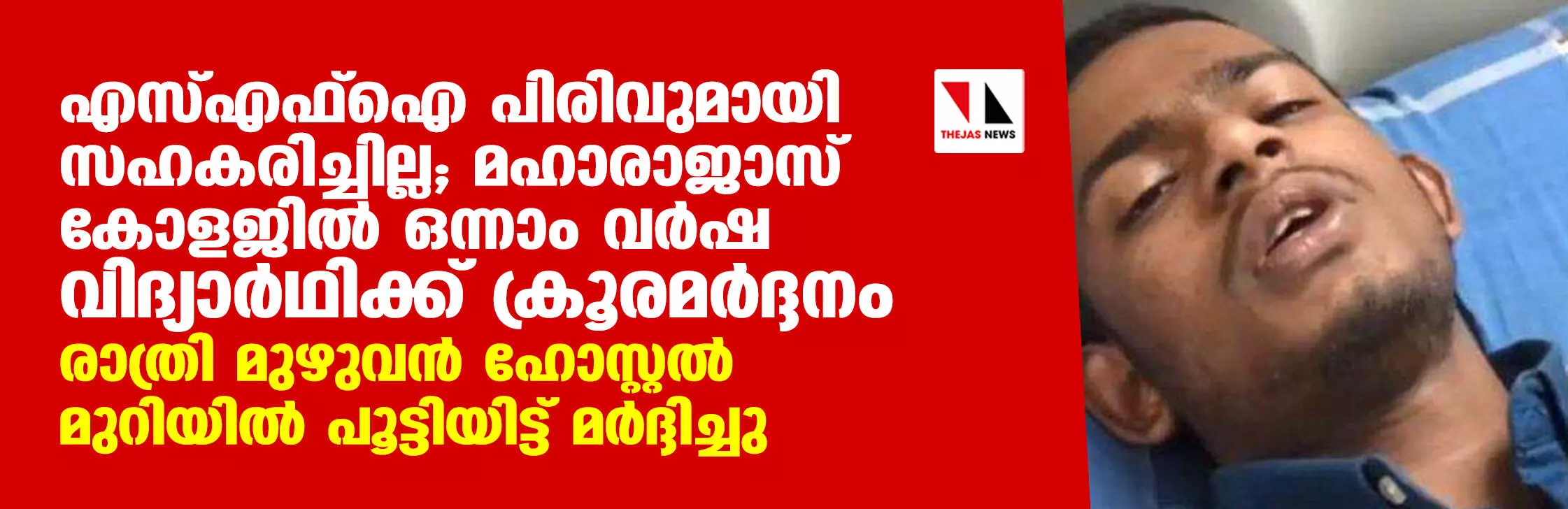 എസ്എഫ്ഐ പിരിവുമായി സഹകരിച്ചില്ല; മഹാരാജാസ് കോളജില് ഒന്നാം വര്ഷ വിദ്യാര്ഥിക്ക് ക്രൂരമര്ദ്ദനം; രാത്രി മുഴുവന് ഹോസ്റ്റല് മുറിയില് പൂട്ടിയിട്ട് മര്ദ്ദിച്ചു