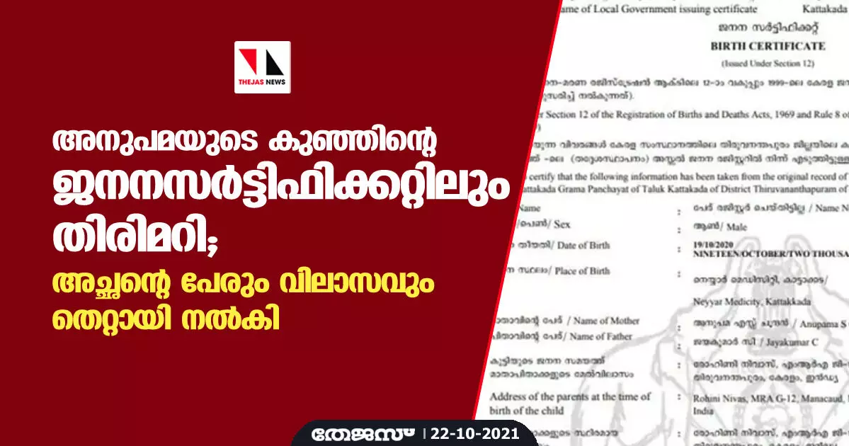 അനുപമയുടെ കുഞ്ഞിന്റെ ജനനസര്ട്ടിഫിക്കറ്റിലും തിരിമറി; അച്ഛന്റെ പേരും വിലാസവും തെറ്റായി നല്കി