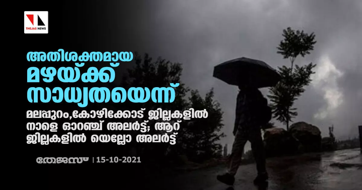 അതിശക്തമായ മഴയ്ക്ക് സാധ്യതയെന്ന്; മലപ്പുറം,കോഴിക്കോട് ജില്ലകളില് നാളെ ഓറഞ്ച് അലര്ട്ട്; ആറു ജില്ലകളില് യെല്ലോ അലര്ട്ട്