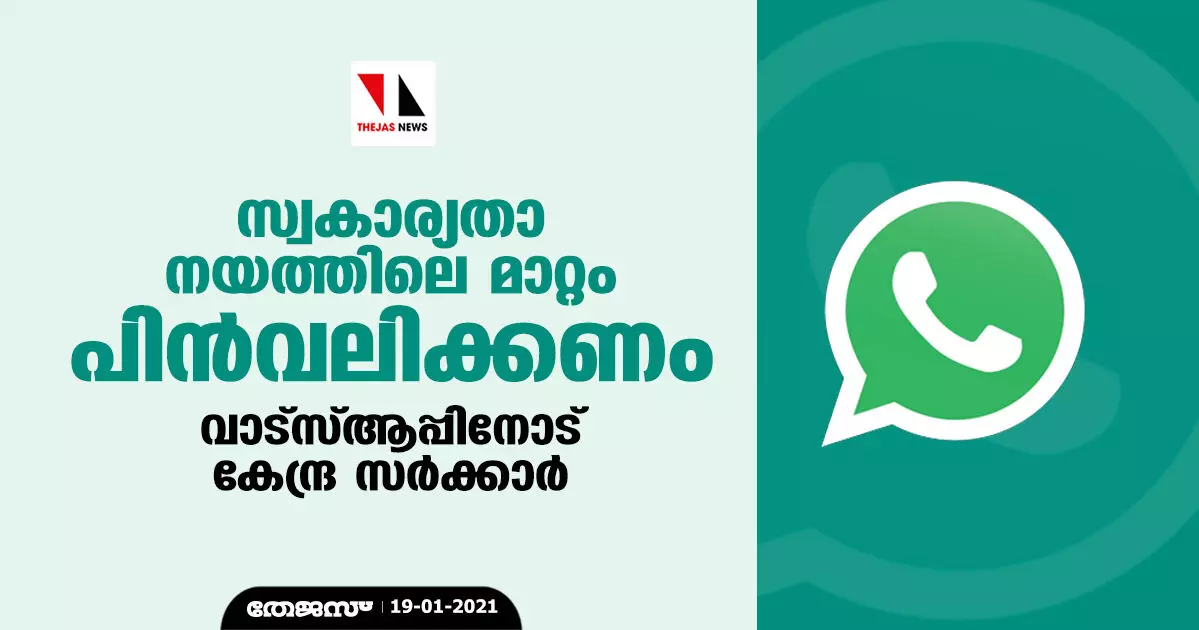 സ്വകാര്യതാ നയത്തിലെ മാറ്റം പിന്വലിക്കണം: വാട്സ്ആപ്പിനോട് കേന്ദ്ര സര്ക്കാര്