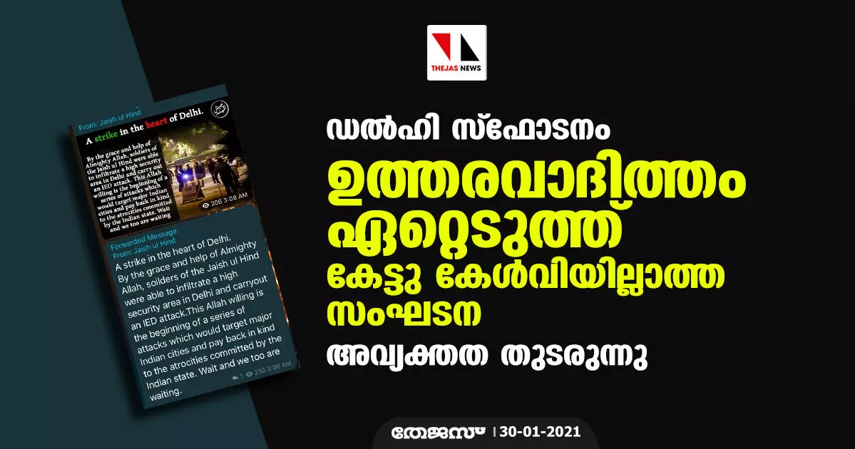 നേരത്തെ സ്ഫോടന സ്ഥലത്തു നിന്നും ഒരു കത്ത് കണ്ടെത്തിയിരുന്നതായാണ് ഔദ്യോഗിക വിശദീകരണം. ഇസ്രായേലിനോടുള്ള പ്രതികാരമാണിതെന്നാണ് സ്ഫോടന സ്ഥലത്തു നിന്നും ലഭിച്ച കത്ത് നല്കുന്ന സൂചനയെന്നും റിപോർട്ടുകൾ ഉണ്ടായിരുന്നു. എന്നാൽ ജയ്ഷ് ഉല് ഹിന്ദിന്റേതെന്ന പേരില് പ്രചരിക്കുന്ന പ്രസ്താവനയില് പറയുന്നത് ഇന്ത്യക്കെതിരെയുള്ള നീക്കമാണെന്നാണ്.