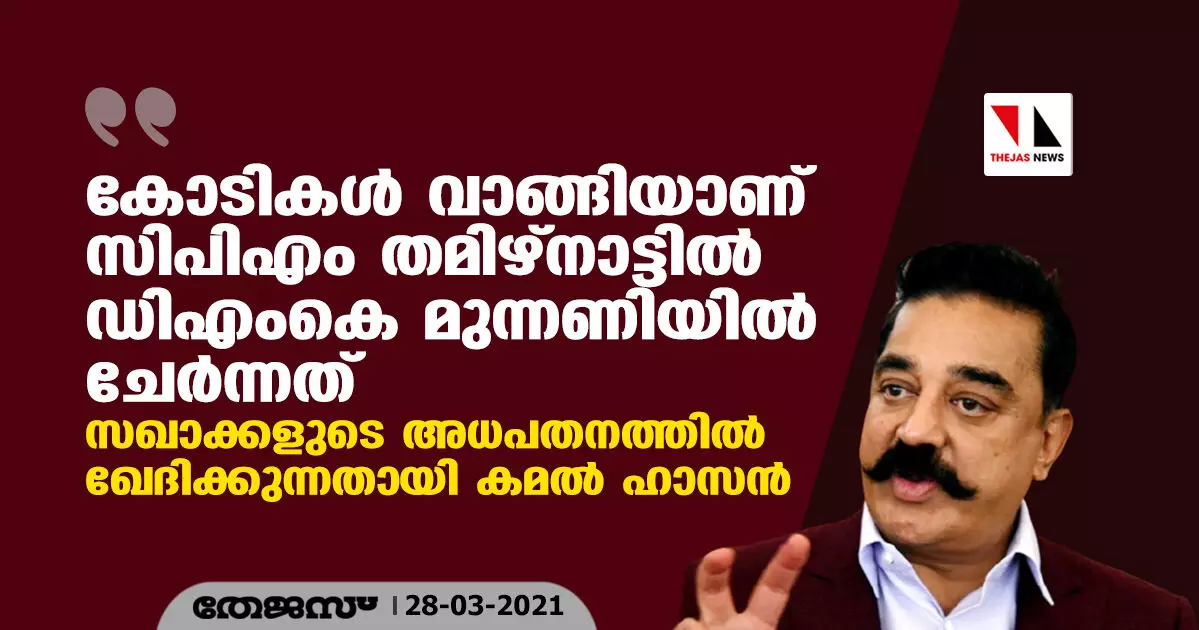 കോടികള് വാങ്ങിയാണ് സിപിഎം തമിഴ്നാട്ടില് ഡിഎംകെ മുന്നണിയില് ചേര്ന്നത്; സഖാക്കളുടെ അധപതനത്തില് ഖേദിക്കുന്നതായി കമല് ഹാസന്