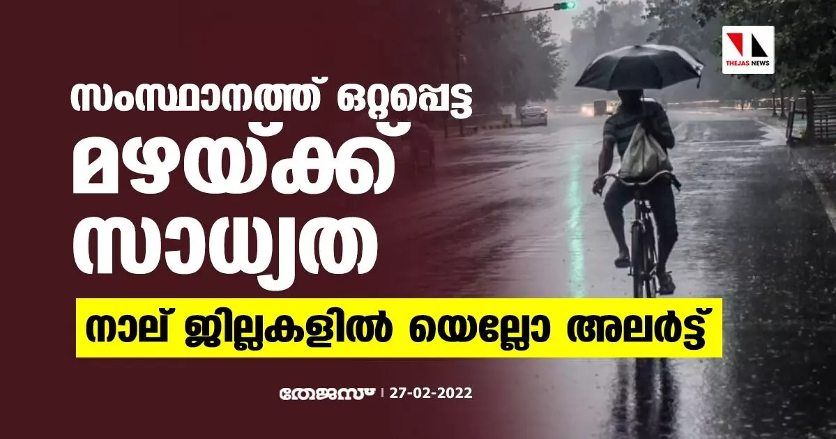 സംസ്ഥാനത്ത് ഒറ്റപ്പെട്ട മഴയ്ക്ക് സാധ്യത; നാല് ജില്ലകളില് യെല്ലോ അലര്ട്ട്