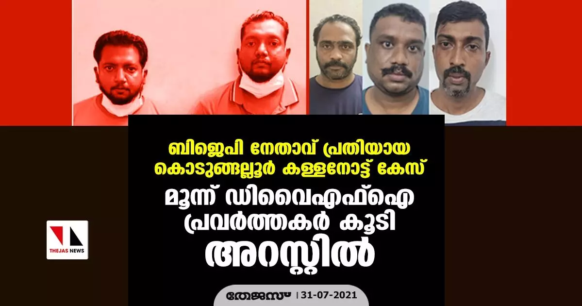 ബിജെപി നേതാവ് പ്രതിയായ കൊടുങ്ങല്ലൂര് കള്ളനോട്ട് കേസ്: മൂന്ന് ഡിവൈഎഫ് ഐ പ്രവര്ത്തകര് കൂടി അറസ്റ്റില്
