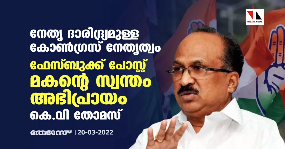 നേതൃ ദാരിദ്ര്യമുള്ള കോണ്ഗ്രസ് നേതൃത്വം; ഫേസ്ബുക്ക് പോസ്റ്റ് മകന്റെ സ്വന്തം അഭിപ്രായം: കെ വി തോമസ്