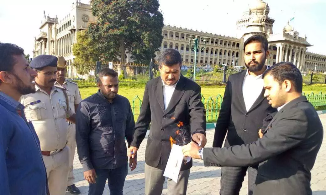 ബെംഗളൂരു: പൗരത്വ ഭേദഗതി നിയമത്തിനെതിരേ ബില്ലിന്റെ കോപ്പി കത്തിച്ച് അഭിഭാഷകരുടെ പ്രതിഷേധം. അഡ്വ. മുഹമ്മദ് താഹിറിന്റെ നേതൃത്വത്തിലാണ് ഒരുകൂട്ടം അഭിഭാഷകരും മനുഷ്യാവകാശ പ്രവര്ത്തകരും ചേര്ന്ന് വിധാന സൗധയ്ക്കു മുന്നില് ബില്ല് കത്തിച്ച് പ്രതിഷേധിച്ചത്. മതത്തിന്റെ അടിസ്ഥാനത്തില് പൗരത്വം ലഭിക്കുന്നതില് നിന്ന് മുസ്ലിംകളെ ഒഴിവാക്കുന്നത് സ്വതന്ത്ര ഇന്ത്യയിലെ ആദ്യത്തെ പ്രവൃത്തിയാണിതെന്നു ഈ രാജ്യം അമുസ്ലിംകള്ക്കായി മാത്രമുള്ളതായി മാറുകയാണെന്നും അഡ്വ. മുഹമ്മദ് താഹിര് പറഞ്ഞു. മറ്റൊരു വിധത്തില് പറഞ്ഞാല് ഈ രാജ്യത്ത് മുസ്ലിംകള്ക്ക് സ്ഥാനമില്ല. ഈ നിയമം സുപ്രിംകോടതി നിരസിക്കുമെന്നാണു കരുതുന്നത്. ഇതിനെതിരേ തെരുവുകളില് പോരാട്ടം നടത്തേണ്ടത് അനിവാര്യമായിരിക്കുകയാണ്. നിയമത്തിനു പിന്നിലെ ഭിന്നിപ്പിക്കല് ഉദ്ദേശ്യം ജനങ്ങള്ക്ക് കാണിച്ചുകൊടുക്കണം. ഭരണഘടനാ വിരുദ്ധമായ 'ഹിന്ദു രാഷ്ട്ര' അജണ്ടയാണ് ആര്എസ്എസും ബിജെപിയും ലക്ഷ്യം വയ്ക്കുന്നതെന്നും അഭിഭാഷകര് ചൂണ്ടിക്കാട്ടി. ഇന്ത്യയുടെ ഭരണഘടന മാറ്റാന് സര്ക്കാര് ആഗ്രഹിക്കുന്നുവെന്നാണ് പൗരത്വ ഭേദഗതി നിയമത്തിലൂടെ വ്യക്തമായി സൂചിപ്പിക്കുന്നത്. ഇതൊരു ഫാഷിസ്റ്റ് നിയമമാണെന്നും ഭരണഘടനാ തത്വങ്ങള്ക്ക് വിരുദ്ധമാണെന്നും പ്രതിഷേധത്തിന്റെ ഭാഗമായിരുന്ന അഡ്വ. ബാലന് പറഞ്ഞു.