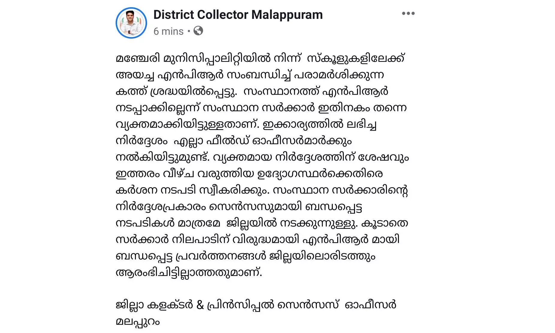 മഞ്ചേരിയിലെ എന്പിആര് സര്ക്കുലര്: ഉദ്യോഗസ്ഥര്ക്കെതിരേ കര്ശന നടപടിയെന്ന് മലപ്പുറം കലക്ടര്