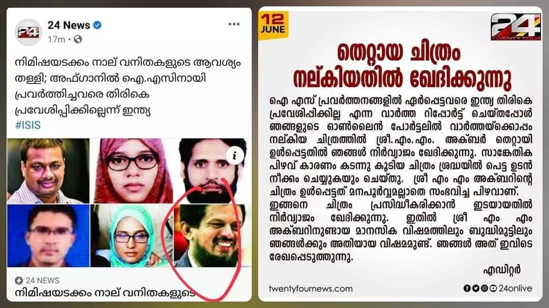 24 ന്യൂസിന്റെ ഓണ്ലൈനില് നല്കിയ വാര്ത്തയില് എം എം അക്ബറിന്റെ ചിത്രം തെറ്റായി ഉള്പ്പെട്ടതില് നിര്വ്യാജം ഖേദിക്കുന്നുവെന്നും സാങ്കേതിക പിഴവ് കാരണം കടന്നുകൂടിയ ചിത്രം ശ്രദ്ധയില്പ്പെട്ട ഉടനെ നീക്കം ചെയ്തെന്നുമാണ് എഡിറ്റര് പ്രസ്താവനയില് അറിയിച്ചത്. അക്ബറിന്റെ ചിത്രം ഉള്പ്പെട്ടത് മനപൂര്വമല്ലാതെ സംഭവിച്ച പിഴവാണ്. ഇതില് എം എം അക്ബറിനുണ്ടായ മാനസിക വിഷമത്തിലും ബുദ്ധിമുട്ടിലും അതിയായ വിഷമമുണ്ടെന്നും അത് രേഖപ്പെടുത്തുന്നുവെന്നുമാണ് എഡിറ്ററുടെ കുറിപ്പിലുള്ളത്. ശ്രീകണ്ഠന് നായരുടെ ഉടമസ്ഥതയിലുള്ളതാണ് 24 ന്യൂസ് ചാനലും ഓണ്ലൈന് പോര്ട്ടലും. നേരത്തേ തബ് ലീഗ് കൊറോണ എന്നു വിശേഷിപ്പിച്ച സംഭവത്തിലും 24 ന്യൂസ് സാങ്കേതികപ്പിഴവെന്ന് പറഞ്ഞ് ക്ഷമാപണം നടത്തിയിരുന്നു. ചാനലിന്റെ നടപടിക്കെതിരേ സാമൂഹിക മാധ്യമങ്ങളിലും വിമര്ശനം ശക്തമായിട്ടുണ്ട്.