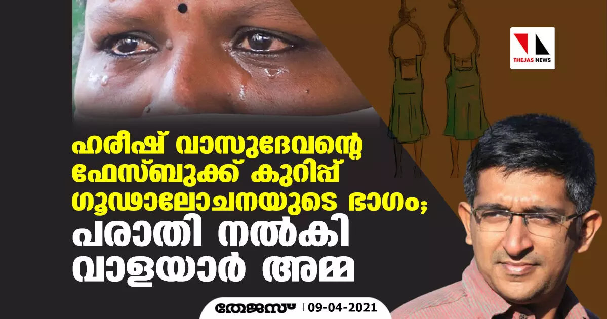 ഹരീഷ് വാസുദേവന്റെ ഫേസ്ബുക്ക് കുറിപ്പ് ഗൂഢാലോചനയുടെ ഭാഗം; പരാതി നല്കി വാളയാര് അമ്മ