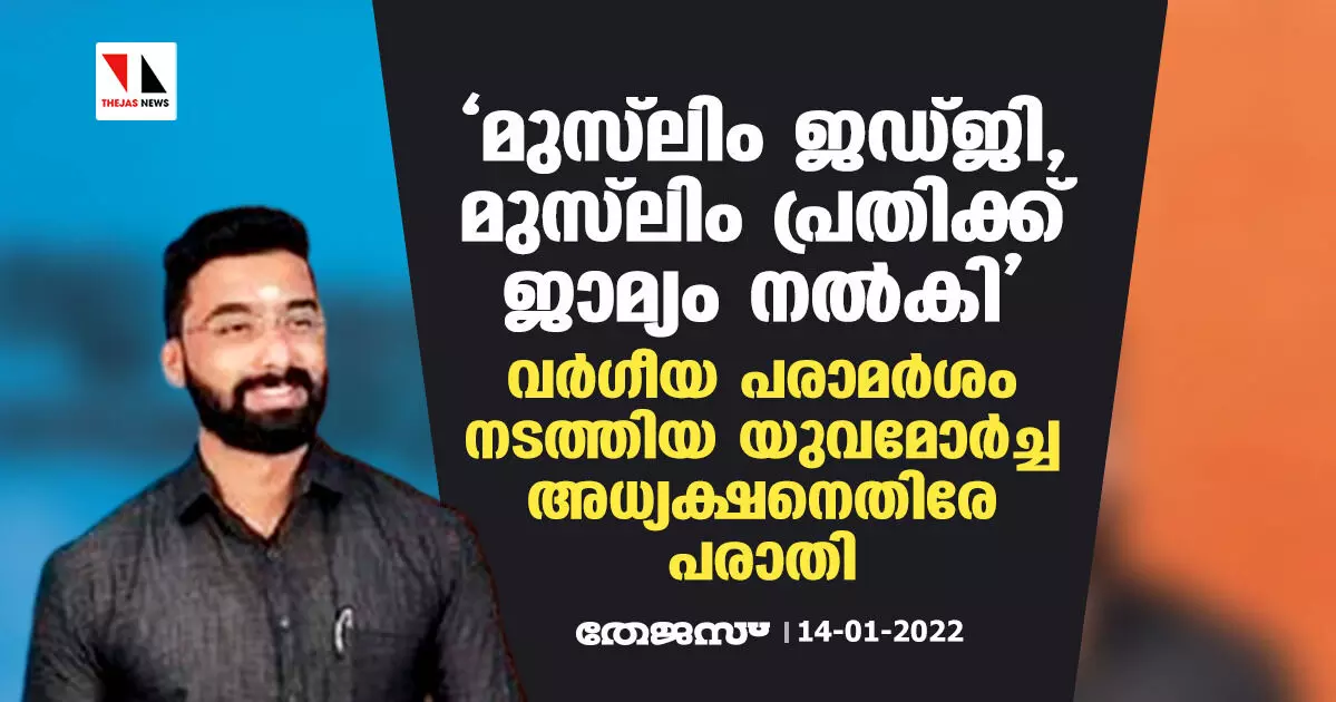 'മുസ്ലിം ജഡ്ജി, മുസ്ലിം പ്രതിക്ക് ജാമ്യം നല്കി'; വര്ഗീയ പരാമര്ശം നടത്തിയ യുവമോര്ച്ച അധ്യക്ഷനെതിരേ പരാതി