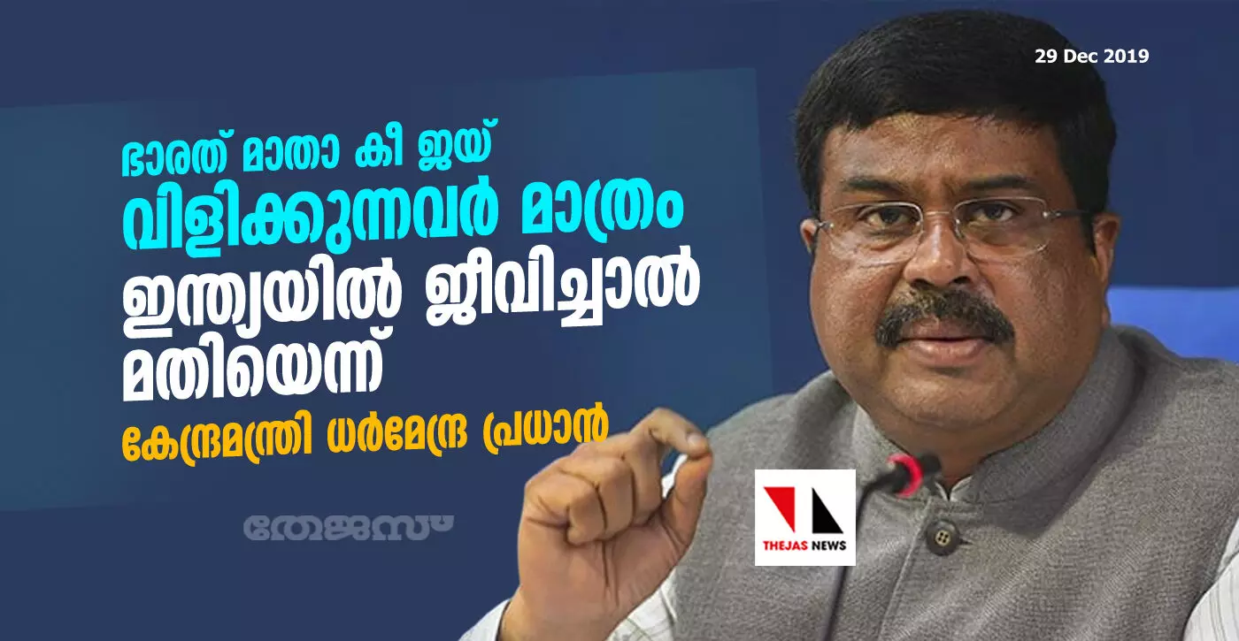 ഭാരത് മാതാ കീ ജയ് വിളിക്കുന്നവര് മാത്രം ഇന്ത്യയില് ജീവിച്ചാല് മതിയെന്ന് കേന്ദ്രമന്ത്രി ധര്മേന്ദ്ര പ്രധാന്