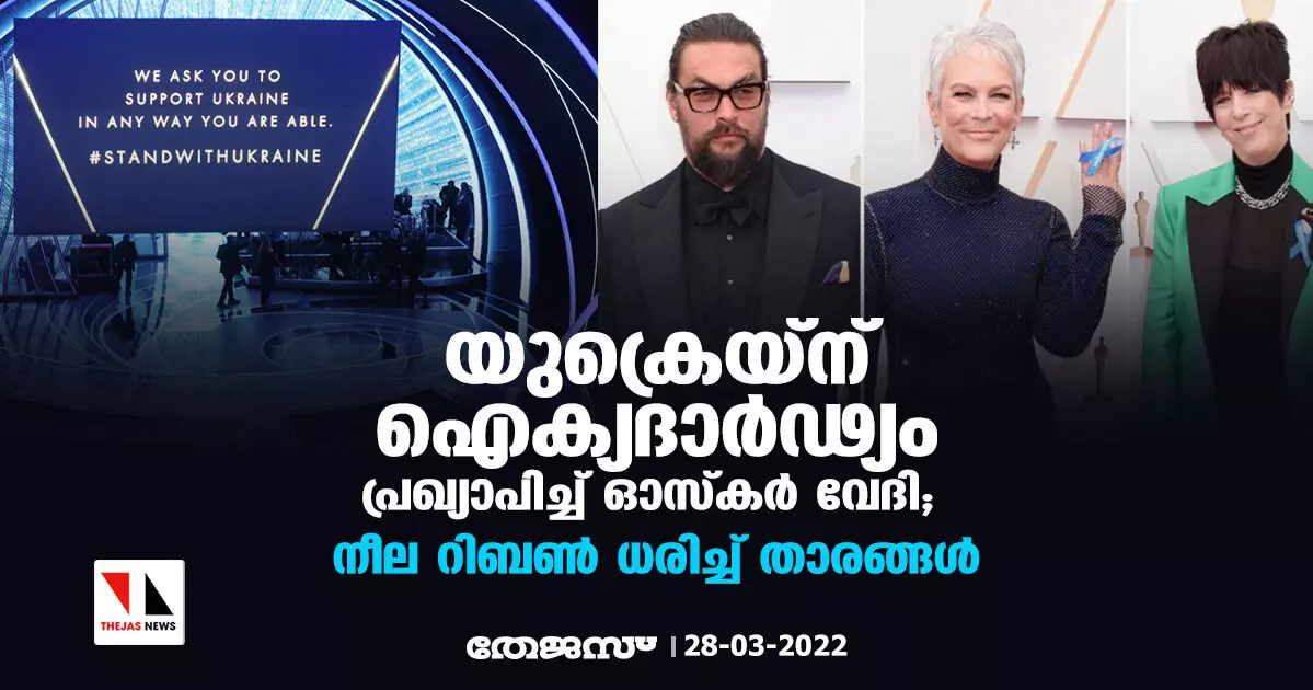 യുക്രെയ്ന് ഐക്യദാര്ഢ്യം പ്രഖ്യാപിച്ച് ഓസ്കര് വേദി; നീല റിബണ് ധരിച്ച് താരങ്ങള്