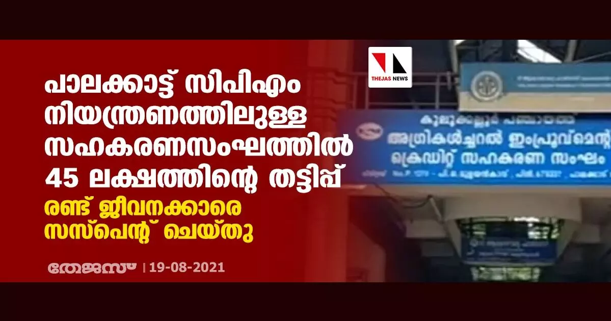 പാലക്കാട്ട് സിപിഎം നിയന്ത്രണത്തിലുള്ള സഹകരണസംഘത്തില് 45 ലക്ഷത്തിന്റെ തട്ടിപ്പ്; രണ്ട് ജീവനക്കാരെ സസ്പെന്റ് ചെയ്തു