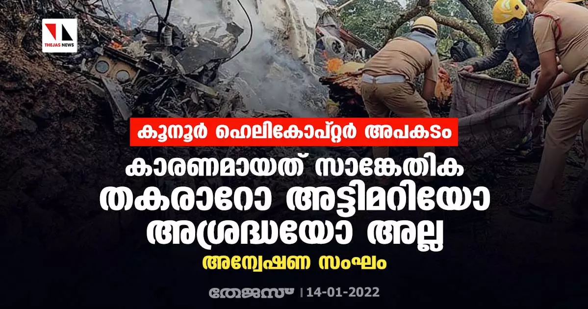 കൂനൂർ ഹെലികോപ്റ്റർ അപകടം: കാരണമായത് സാങ്കേതിക തകരാറോ അട്ടിമറിയോ അശ്രദ്ധയോ അല്ല: അന്വേഷണ സംഘം
