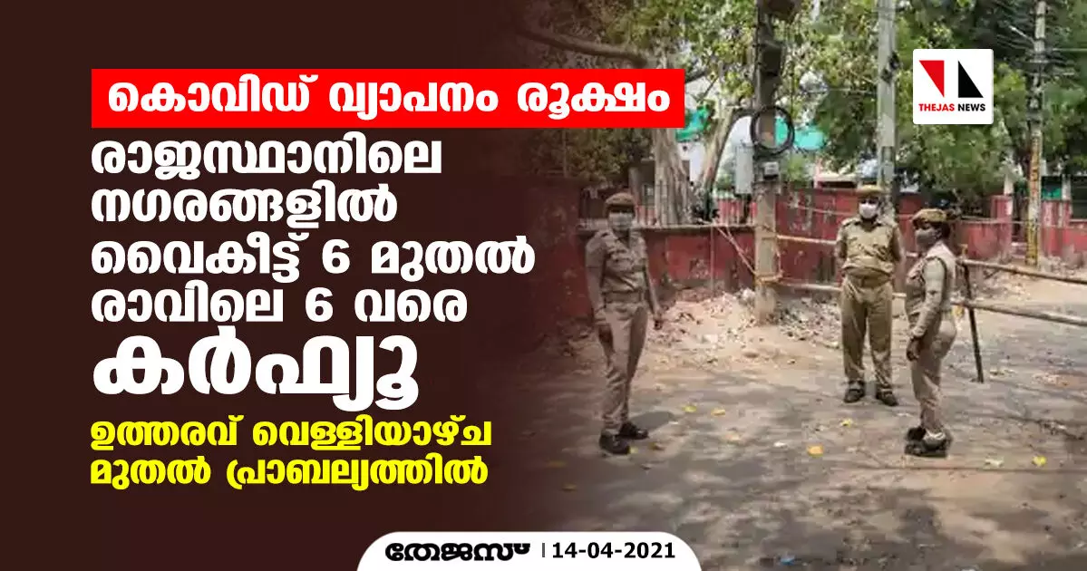 കൊവിഡ് വ്യാപനം രൂക്ഷം; രാജസ്ഥാനിലെ നഗരങ്ങളില് വൈകീട്ട് 6 മുതല് രാവിലെ 6 വരെ കര്ഫ്യൂ, ഉത്തരവ് വെള്ളിയാഴ്ച മുതല് പ്രാബല്യത്തില്