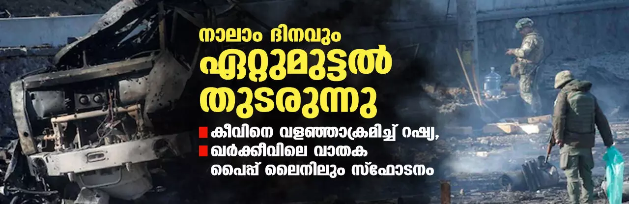 നാലാം ദിനവും ഏറ്റുമുട്ടല് തുടരുന്നു; കീവിനെ വളഞ്ഞാക്രമിച്ച് റഷ്യ, ഖര്ക്കീവിലെ വാതക പൈപ്പ് ലൈനിലും സ്ഫോടനം