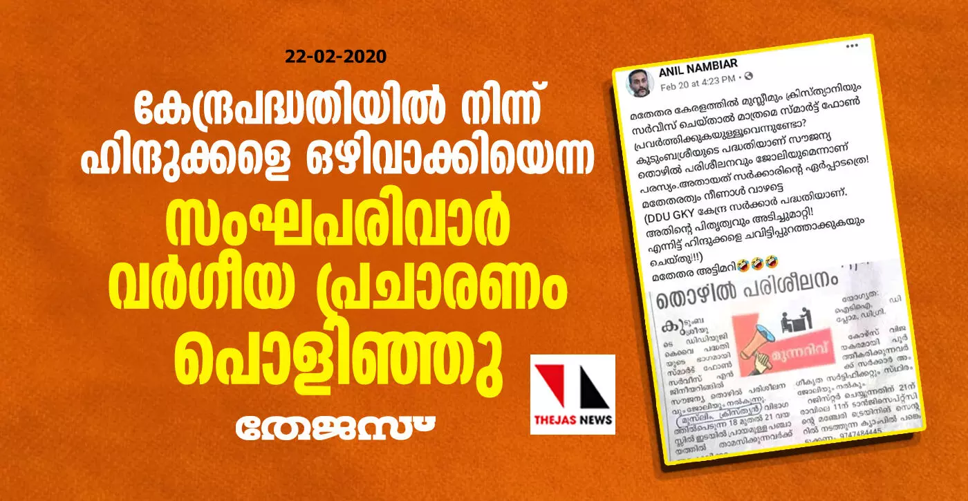 'മതേതര കേരളത്തില് മുസ് ലിമും ക്രിസ്ത്യാനിയും സര്വീസ് ചെയ്താല് മാത്രമെ സ്മാര്ട്ട് ഫോണ് പ്രവര്ത്തിക്കുകയുള്ളൂവെന്നുണ്ടോ?. കുടുംബശ്രീയുടെ പദ്ധതിയാണ് സൗജന്യ തൊഴില് പരിശീലനവും ജോലിയുമെന്നാണ് പരസ്യം. അതായത് സര്ക്കാരിന്റെ ഏര്പാടത്രെ!. മതേതരത്വം നീണാള് വാഴട്ടെ. (DDU GKY കേന്ദ്ര സര്ക്കാര് പദ്ധതിയാണ്. അതിന്റെ പിതൃത്വവും അടിച്ചുമാറ്റി! എന്നിട്ട് ഹിന്ദുക്കളെ ചവിട്ടിപ്പുറത്താക്കുകയും ചെയ്തു!!!). മതേതര അട്ടിമറി'. ഇതായിരുന്നു അനില് നമ്പ്യാരുടെ ഫേസ്ബുക്ക് പോസ്റ്റ്. സംവരണ സീറ്റിലേക്ക് അപേക്ഷ ക്ഷണിച്ച് കൊണ്ടുള്ള പത്ര പരസ്യത്തിന്റെ കട്ടിങ്ങും ഇതോടൊപ്പം ചേര്ത്ത് കൊണ്ടായിരുന്നു നമ്പ്യാരുടെ വര്ഗീയ പ്രചാരണം.