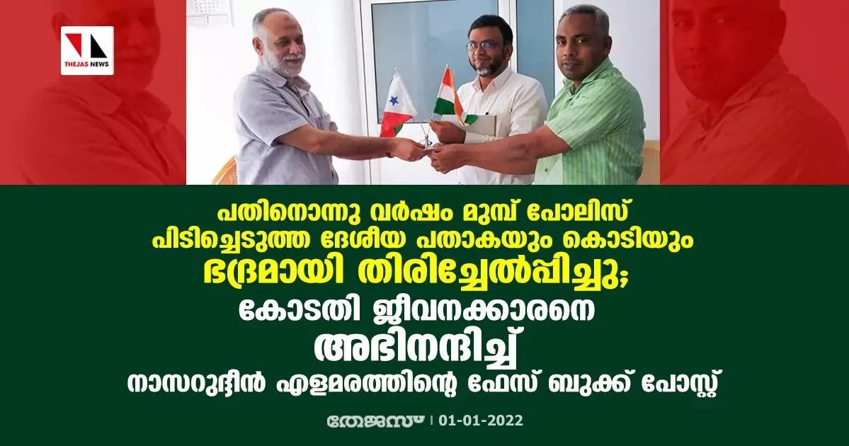 പതിനൊന്നു വര്ഷം മുമ്പ് പോലിസ് പിടിച്ചെടുത്ത ദേശീയ പതാകയും കൊടിയും ഭദ്രമായി തിരിച്ചേല്പ്പിച്ചു; കോടതി ജീവനക്കാരനെ അഭിനന്ദിച്ച് നാസറുദ്ദീന് എളമരത്തിന്റെ ഫേസ് ബുക്ക് പോസ്റ്റ്