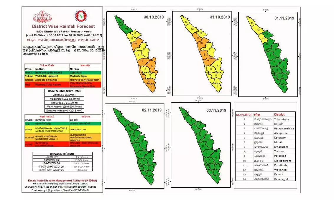2019 ഒക്ടോബര് 30ന് തിരുവനന്തപുരം, കൊല്ലം, ആലപ്പുഴ, എറണാകുളം, ഇടുക്കി, മലപ്പുറം എന്നീ ജില്ലകളിലും 31 ന് എറണാകുളം, തൃശൂര്, മലപ്പുറം, കോഴിക്കോട് എന്നീ ജില്ലകളിലും കേന്ദ്ര കാലാവസ്ഥ വകുപ്പ് ഓറഞ്ച് അലര്ട്ട് പ്രഖ്യാപിച്ചു. ഓറഞ്ച് പ്രഖ്യാപിക്കപ്പെട്ട ജില്ലകളില് ഒറ്റപ്പെട്ടയിടങ്ങളില് ശക്തമായതോ(115 മില്ലിമീറ്റര് വരെ മഴ) അതിശക്തമായതോ (115 മില്ലിമീറ്റര് മുതല് 204.5 മില്ലിമീറ്റര് വരെ മഴ) ആയ മഴയ്ക്കുള്ള സാധ്യതയാണ് പ്രവചിക്കപ്പെട്ടിരിക്കുന്നത്. സര്ക്കാര് സംവിധാനങ്ങളും പൊതുജനങ്ങളും ജാഗ്രത പാലിക്കാനുള്ള മുന്നറിയിപ്പാണ് ഓറഞ്ച് അലര്ട്ട് കൊണ്ടുദ്ദേശിക്കുന്നത്.
