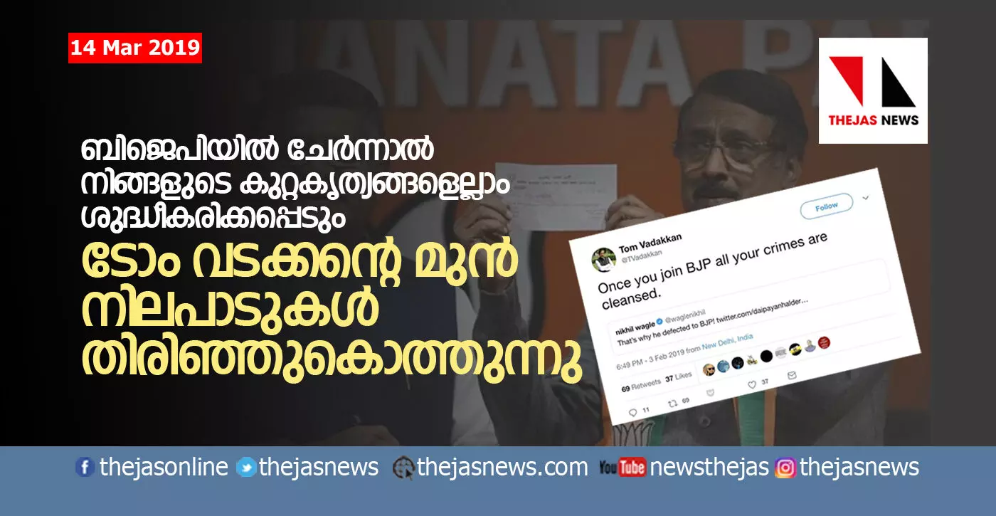ന്യൂഡല്ഹി: ബിജെപിയില് ചേര്ന്ന മുതിര്ന്ന കോണ്ഗ്രസ് നേതാവ് ടോം വടക്കന്റെ മുന് നിലപാടുകള് തിരിഞ്ഞുകൊത്തുന്നു. ചാനല് ചര്ച്ചകളിലും വാര്ത്താസമ്മേളനങ്ങളിലുമെല്ലാം ബിജെപിക്കും നരേന്ദ്രമോദിക്കും അമിത്ഷായ്ക്കുമെതിരേ ആഞ്ഞടിച്ചിരുന്ന മുന് കോണ്ഗ്രസ് വക്താവ് കൂടിയായ ടോം വടക്കന് ഈയടുത്ത കാലത്ത് വരെ ബിജെപിയെ പരിഹസിക്കുകയും വിമര്ശിക്കുകയും ചെയ്തതാണ് ഇപ്പോള് സാമൂഹിക മാധ്യമങ്ങളിലൂടെ ഉള്പ്പെടെ തിരിച്ചടിക്കുന്നത്. ദിവസങ്ങള്ക്കു മുമ്പ് വരെ ചാനല് ചര്ച്ചയില് പങ്കെടുത്ത് കോണ്ഗ്രസിനെയും രാഹുലിനെയും പ്രതിരോധിച്ച ടോം വടക്കന്, 2019 ഫെബ്രുവരി മൂന്നിന് വൈകീട്ട് 6.49ന് ട്വിറ്ററില് കുറിച്ച വാചകങ്ങള് കാണാം. നിങ്ങള് ഒരിക്കല് ബിജെപിയില് ചേര്ന്നാല് നിങ്ങളുടെ എല്ലാ കുറ്റകൃത്യങ്ങളും ശുദ്ധീകരിക്കപ്പെടും എന്നാണ്. കോണ്ഗ്രസില് നിന്ന് ഉള്പ്പെടെ പലയിടത്തും ഇതര പാര്ട്ടികളില് നിന്ന് ബിജെപിയിലേക്ക് നേതാക്കള് ചേക്കേറുന്നതിനെതിരേയാണ് ടോം വടക്കന് പരിഹസിച്ചത്. പലയിടത്തും ക്രിമിനല് കേസുകളില് പെട്ടവരാണ് ബിജെപിയില് ചേര്ന്നത് എന്നതിനാലാണ് ഇത്തരം പരാമര്ശം നടത്തിയത്. എന്നാല്, കൃത്യം 39 ദിവസം മുമ്പ് ടോം തന്റെ കുറിച്ച വാക്കുകള് ഇപ്പോഴും അദ്ദേഹത്തിന്റെ ട്വിറ്ററിലുണ്ട്. ബിജെപിയില് ചേര്ന്ന അദ്ദേഹം മോദിക്കും അമിത് ഷായ്ക്കും നന്ദി പറയുകയും തീരുമാനം വ്യക്തിപരമല്ലെന്നും പുല്വാമ ആക്രമണത്തില് കോണ്ഗ്രസ് സ്വീകരിച്ച നിലപാടില് പ്രതിഷേധിച്ചാണെന്നും പറയുന്ന അദ്ദേഹം, ക്രിമിനലുകളെയാണ് ബെജെപി സ്വീകരിക്കുന്നതെന്നാണു പറഞ്ഞുവച്ചത്. എന്നാല്, ട്വീറ്റ് പോലും മായ്ക്കപ്പെടുന്നതിനു മുമ്പ് തന്നെ അതേ ടോം വടക്കന് ബിജെപിയിലെത്തിയതിനെ ട്രോളുകള് കൊണ്ട് മൂടുമെന്നതില് സംശയമില്ല. പാര്ലിമെന്റ് അംഗത്വം ലഭിക്കില്ലെന്ന് ഉറപ്പായതോടെയാണ് ടോം വടക്കന് കോണ്ഗ്രസ് വിട്ടതെന്ന ആരോപണം ശരിവയ്ക്കുന്നതാണ്, അദ്ദേഹം കേരളത്തില് നിന്ന് ബിജെപി ടിക്കറ്റില് മല്സരിക്കുമെന്ന സൂചനകളിലൂടെ പുറത്തുവരുന്നത്.