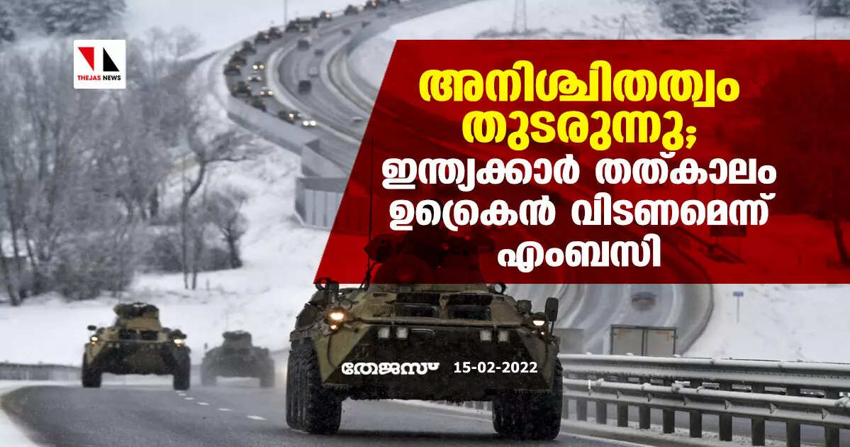 "ഉക്രൈനിലെ നിലവിലെ സാഹചര്യത്തിന്റെ അനിശ്ചിതത്വങ്ങൾ കണക്കിലെടുത്ത് ഇന്ത്യൻ പൗരന്മാർ, പ്രത്യേകിച്ചും താമസം അനിവാര്യമല്ലാത്ത വിദ്യാര്ഥികള് താത്കാലികമായി രാജ്യം വിടുന്നത് പരിഗണിക്കണം. ഇന്ത്യൻ പൗരന്മാരോട് ഉക്രൈനിലൂടെയുള്ള അനാവശ്യ യാത്രകള് ഒഴിവാക്കാനും നിര്ദേശിക്കുന്നു," കീവിലുള്ള ഇന്ത്യന് എംബസിയുടെ പ്രസ്താവനയില് പറയുന്നു.