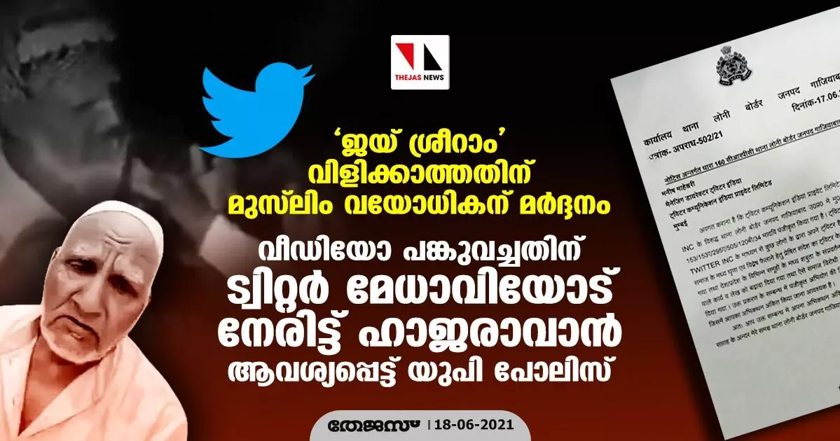 'ജയ് ശ്രീറാം' വിളിക്കാത്തതിന് മുസ്ലിം വയോധികന് മര്ദ്ദനം; വീഡിയോ പങ്കുവച്ചതിന് ട്വിറ്റര് മേധാവിയോട് നേരിട്ട് ഹാജരാവാന് ആവശ്യപ്പെട്ട് യുപി പോലിസ്