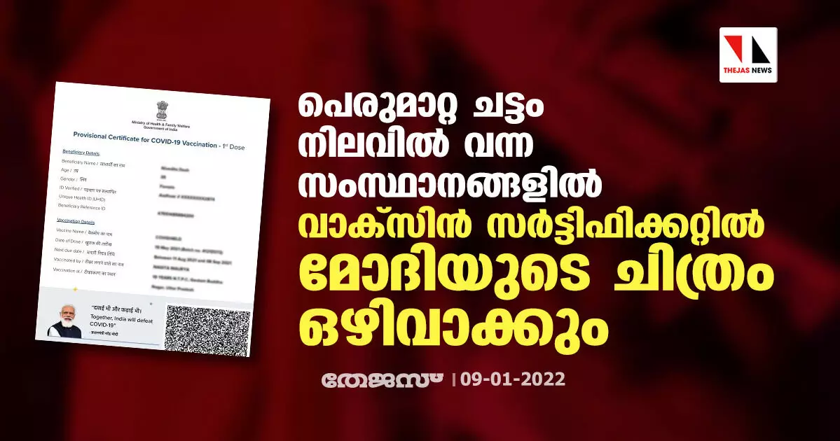 തിരഞ്ഞെടുപ്പ് നടക്കുന്ന അഞ്ച് സംസ്ഥാനങ്ങളിൽ പെരുമാറ്റച്ചട്ടം നിലവിൽ വന്നതിനാൽ ഇവിടങ്ങളിലുള്ള ജനങ്ങൾക്ക് നൽകുന്ന കൊവിഡ് വാക്സിനേഷൻ സർട്ടിഫിക്കറ്റിൽ നിന്ന് പ്രധാനമന്ത്രി നരേന്ദ്ര മോദിയുടെ ചിത്രം ഒഴിവാക്കും