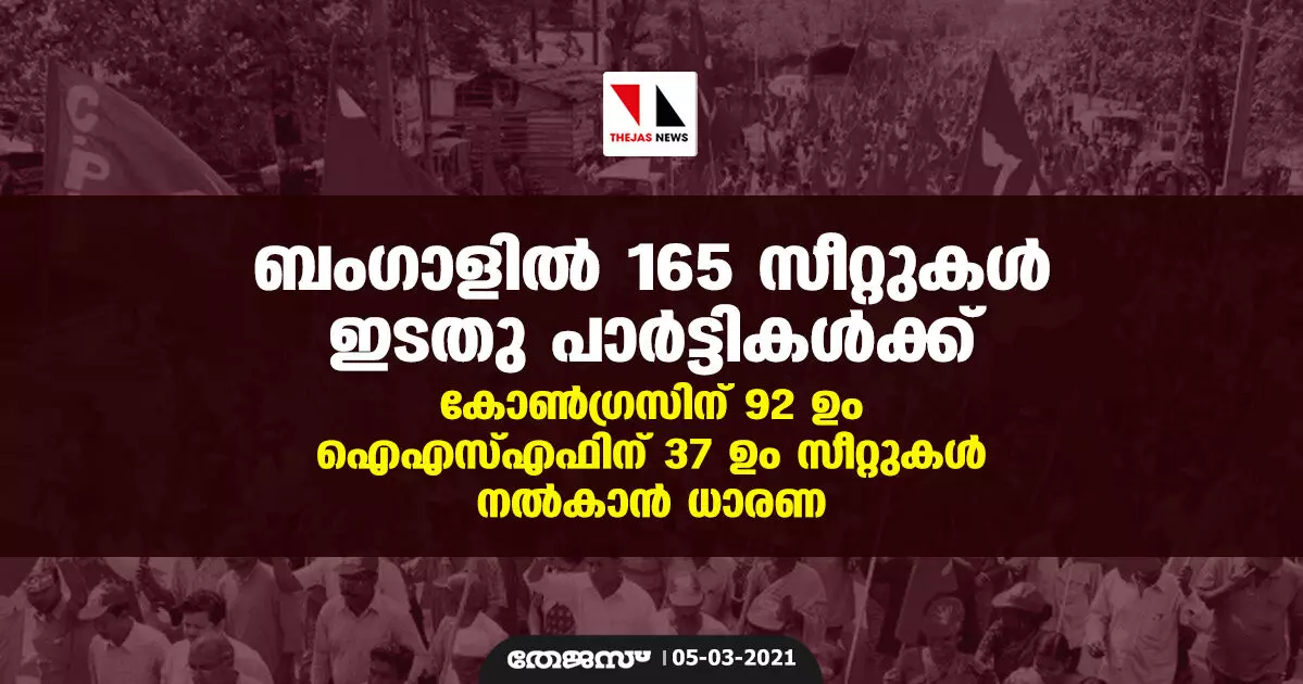 ഇടതുപാര്ട്ടികള് 165 സീറ്റുകളില് മല്സരിക്കും. കോണ്ഗ്രസ് 92 സീറ്റുകളിലും ജനവിധി തേടും. ഇന്ത്യന് സെക്കുലര് ഫ്രണ്ടിന് (ഐഎസ്എഫ്) 37 സീറ്റ് നല്കാനും ധാരണയായി.