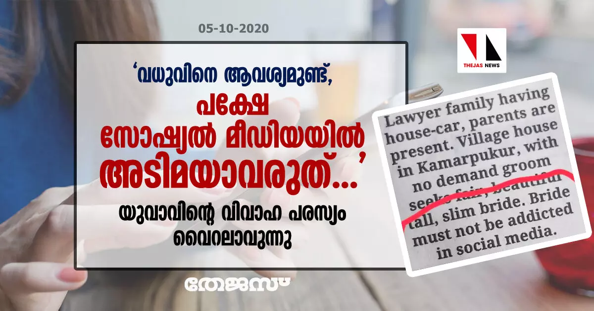 'വധുവിനെ ആവശ്യമുണ്ട്, പക്ഷേ സോഷ്യല് മീഡിയയില് അടിമയാവരുത്...'; യുവാവിന്റെ വിവാഹ പരസ്യം വൈറലാവുന്നു
