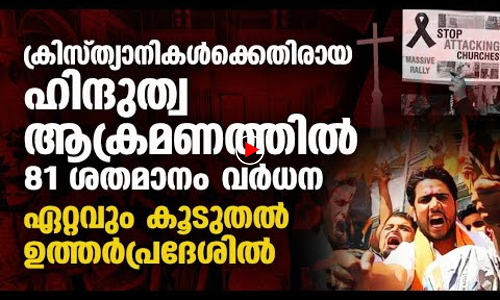 ഇന്ത്യയിൽ ക്രിസ്ത്യാനികൾക്കെതിരായ ഹിന്ദുത്വ ആക്രമണങ്ങളിൽ 81 ശതമാനം വർധന. രാജ്യത്തിന്റെ വിവിധ ഭാഗങ്ങളിലായി കഴിഞ്ഞ ഒരു വർഷത്തിനിടെ 505 ആക്രമണങ്ങൾ നടന്നു. ഉത്തർപ്രദേശിൽ മാത്രം റിപോർട്ട് ചെയ്യപ്പെട്ടത് 105 കേസുകൾ