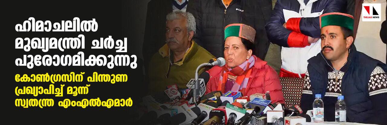 ഹിമാചലില് മുഖ്യമന്ത്രി ചര്ച്ച പുരോഗമിക്കുന്നു; കോണ്ഗ്രസിന് പിന്തുണ പ്രഖ്യാപിച്ച് മൂന്ന് സ്വതന്ത്ര എംഎല്എമാര്
