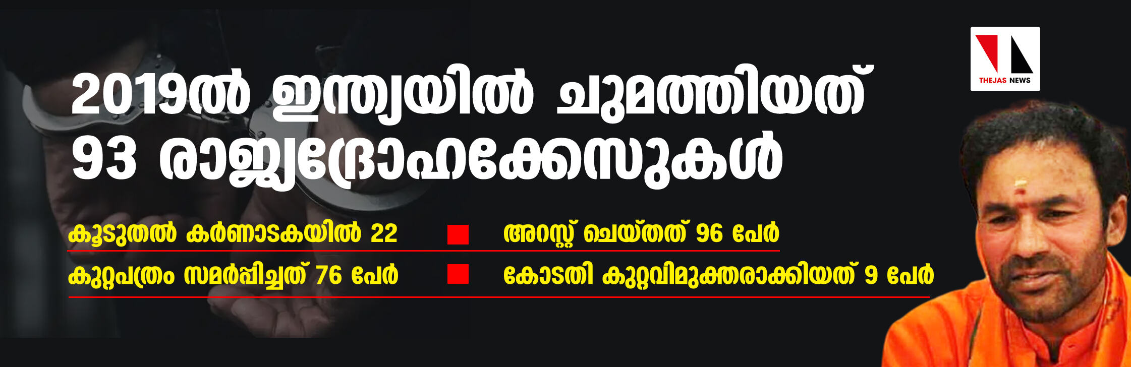 2019ല് ഇന്ത്യയില് ചുമത്തിയത് 93 രാജ്യദ്രോഹക്കേസുകള്