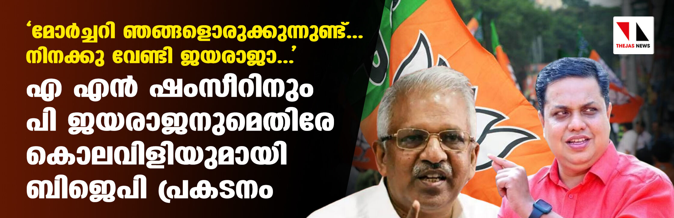 കണ്ണൂര്: നിയമസഭാ സ്പീക്കര് എ എന് ഷംസീറിനും സിപിഎം സംസ്ഥാന കമ്മിറ്റിയംഗം പി ജയരാജനുമെതിരേ പരസ്യമായ കൊലവിളിയുമായി ബിജെപി പ്രകടനം. തലശ്ശേരിയിലും മാഹിക്കു സമീപം പള്ളൂരിലും നടത്തിയ പ്രകടനത്തിലാണ് കൊലവിളി നടത്തിയത്. 'മോര്ച്ചറി ഞങ്ങളൊരുക്കുന്നുണ്ട്...നിനക്കു വേണ്ടി ജയരാജാ...' എന്നും '...കൈയും കൊത്തി തലയും കൊത്തി കാളീപൂജ നടത്തും ഞങ്ങള്...ഓര്ത്തുകളിച്ചോ ഷംസീറേ...' എന്നും മറ്റുമാണ് മുദ്രാവാക്യം വിളിച്ചത്. 'ഞങ്ങളൊന്ന് തിരിച്ചടിച്ചാല് മോര്ച്ചറിയൊന്നും തികയില്ല. ഹിന്ദുക്കളുടെ നേരെ വന്നാല് കൈയും കൊത്തും തലയും കൊത്തും ഒറ്റക്കൈയ്യാ ജയരാജാ ഓര്ത്തുകളിച്ചോ സുക്ഷിച്ചോ ' എന്നു തുടങ്ങി അത്യന്തം പ്രകോപനവും ഭീഷണി മുഴക്കുന്നതുമാ കൊലവിളി മുദ്രാവാക്യങ്ങളാണ് വിളിച്ചത്. ഇതിന്റെ വീഡിയോ ദൃശ്യങ്ങള് സാമൂഹിക മാധ്യമങ്ങളില് വ്യാപകമായി പ്രചരിക്കുന്നുണ്ട്. ഇതോടെ കണ്ണൂര് രാഷ്ട്രീയം വീണ്ടും സംഘര്ഷത്തിലേക്ക് നീങ്ങുകയാണെന്ന ആശങ്ക ശക്തമായിട്ടുണ്ട്.