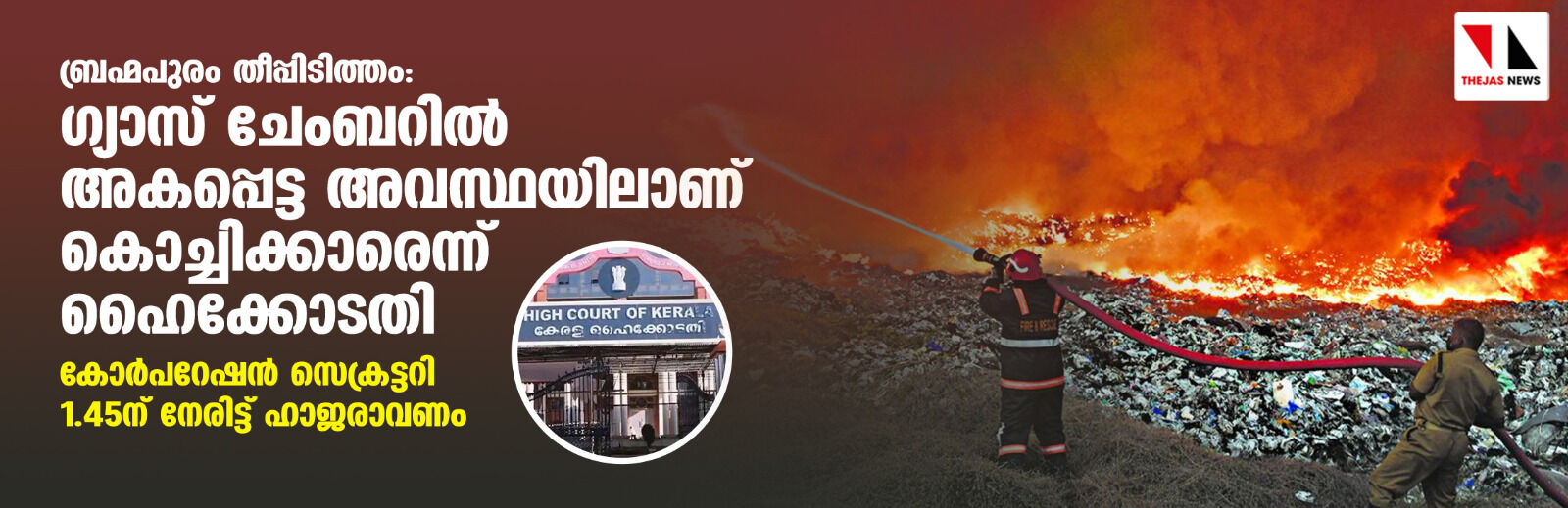 ബ്രഹ്മപുരം തീപ്പിടിത്തം: ഗ്യാസ് ചേംബറില് അകപ്പെട്ട അവസ്ഥയിലാണ് കൊച്ചിക്കാരെന്ന് ഹൈക്കോടതി; കോര്പറേഷന് സെക്രട്ടറി 1.45ന് നേരിട്ട് ഹാജരാവണം