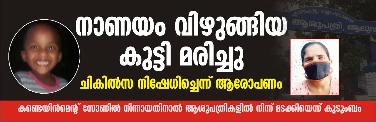 കുട്ടിയെ ആദ്യം ആലുവ സര്ക്കാര് ആശുപത്രിയിലാണ് എത്തിച്ചത്. അവിടെ നിന്ന് എറണാകുളം ജനറല് ആശുപത്രിയിലേക്ക് പോവാന് പറഞ്ഞു. എറണാകുളം ജനറല് ആശുപത്രിയിയിലെ നിര്ദേശപ്രകാരം ആലപ്പുഴ മെഡിക്കല് കോളജിലും കുട്ടിയെ കൊണ്ടുപോയി. കുട്ടിക്ക് പഴവും ചോറും കൊടുത്താല് മതിയെന്ന് പറഞ്ഞു മടക്കിയെന്നാണ് കുടുംബത്തിന്റെ ആരോപണം. ഇന്നലെ രാത്രിയോടെ കുട്ടിയുടെ നില മോശമായി. ആശുപത്രിയില് എത്തിച്ചപ്പോഴേക്കും മരണപ്പെടുകയായിരുന്നു. കണ്ടെയ്ന്മെന്റ് സോണില് നിന്ന് വരുന്നതിനാല് കുട്ടിയെ അഡ്മിറ്റ് ചെയ്യാനാവില്ലെന്ന് ആലപ്പുഴ മെഡിക്കല് കോളജില് നിന്ന് പറഞ്ഞെന്നാണ് കുട്ടിയുടെ മാതാവ് നന്ദിനി പറയുന്നത്. എന്നാല്, പീഡിയാട്രിക് സര്ജന് ഇല്ലാത്തതിനാലാണ്