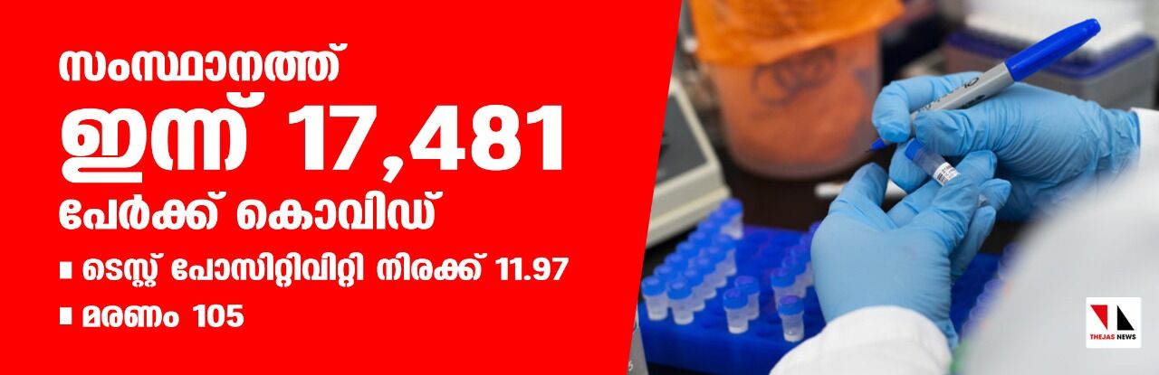 ഇന്ന് 17,481 പേര്ക്ക് കൊവിഡ്; മരണം 105, ടെസ്റ്റ് പോസിറ്റിവിറ്റി നിരക്ക് 11.97
