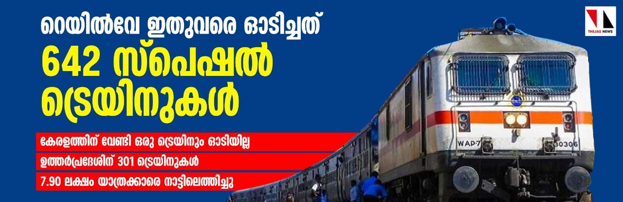 റെയില്വേ ഇതുവരെ ഓടിച്ചത് 642 സ്പെഷല് ട്രെയിനുകള്; കേരളത്തിന് വേണ്ടി ഒരു ട്രെയിനും ഓടിയില്ല -ഉത്തര്പ്രദേശിന് 301 ട്രെയിനുകള്