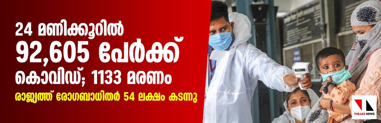 24 മണിക്കൂറില് 92,605 പേര്ക്ക് കൊവിഡ്; 1133മരണം; രാജ്യത്ത് രോഗബാധിതര് 54 ലക്ഷം കടന്നു