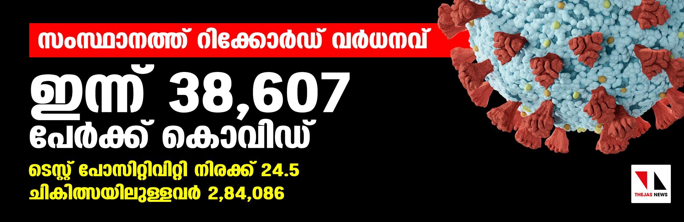 സംസ്ഥാനത്ത് റിക്കോര്ഡ് വര്ധനവ്: ഇന്ന് 38,607 പേര്ക്ക് കൊവിഡ്; ടെസ്റ്റ് പോസിറ്റിവിറ്റി 24.5; ചികിത്സയിലുള്ളവര് 2,84,086