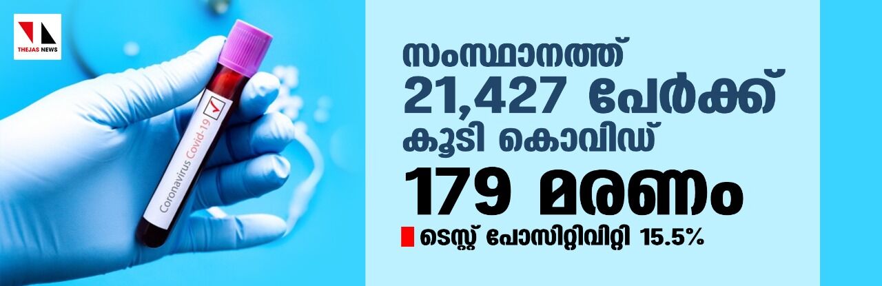 സംസ്ഥാനത്ത് ഇന്ന് 21,427 പേര്ക്ക് കൊവിഡ്; ടെസ്റ്റ് പോസിറ്റിവിറ്റി നിരക്ക് 15.5; മരണം 179