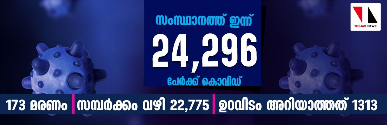 സംസ്ഥാനത്ത് ഇന്ന് 24,296 പേര്ക്ക് കൊവിഡ്; ടെസ്റ്റ് പോസിറ്റിവിറ്റി നിരക്ക് 18.04; മരണം 173