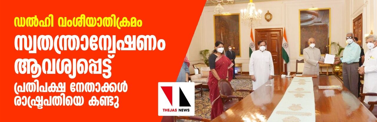 ന്യൂഡൽഹി: ഫെബ്രുവരിയിൽ വടക്കുകിഴക്കൻ ഡൽഹിയിൽ നടന്ന വംശീയാതിക്രമത്തിൽ സ്വതന്ത്രാന്വേഷണം ആവശ്യപ്പെട്ട് പ്രതിപക്ഷ നേതാക്കൾ രാഷ്ട്രപതിയെ കണ്ടു. പൗരത്വ പ്രക്ഷോഭങ്ങൾ നേരെ നടന്ന വംശീയാതിക്രമത്തിൽ ഇരകളാക്കപ്പെട്ടവരെ വ്യാപകമായി വേട്ടയാടുന്ന സാഹചര്യത്തിലാണ് പ്രതിപക്ഷ നേതാക്കൾ വ്യാഴാഴ്ച രാഷ്ട്രപതി രാം നാഥ് കോവിന്ദിനെ കണ്ടത്.
