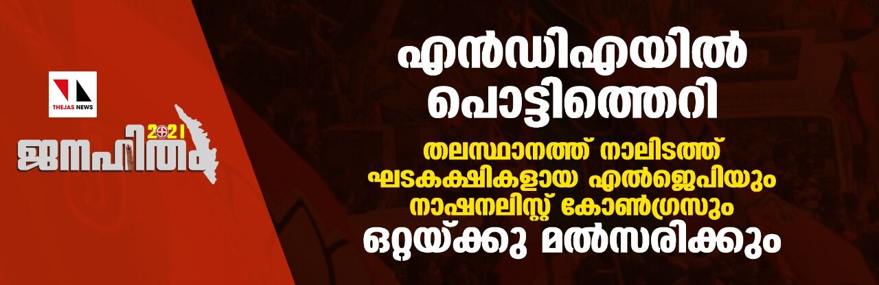 തിരുവനന്തപുരം: എന്ഡിഎയില് പുതിയ തലവേദന സൃഷ്ടിച്ച് ഘടക കക്ഷികളായ എല്ജെപിയും നാഷനലിസ്റ്റ് കോണ്ഗ്രസും ഒറ്റയ്ക്കു മല്സരിക്കുന്നു. ഘടകകക്ഷികളായ ലോക് ജന്ശക്തി പാര്ട്ടിയും നാഷനലിസ്റ്റ് കോണ്ഗ്രസ് പാര്ട്ടിയും തിരുവനന്തപുരം ജില്ലയിലെ നാല് മണ്ഡലങ്ങളിലാണ് ഒറ്റയ്ക്ക് മല്സരിക്കുന്നത്. കോവളം, നെയ്യാറ്റിന്കര, വട്ടിയൂര്ക്കാവ്, പാറശ്ശാല എന്നീ മണ്ഡലങ്ങളില് ഒറ്റയ്ക്ക് മല്സരിക്കും. എന്ഡിഎ സീറ്റു നല്കാത്തതിലും പരിഗണിക്കാത്തതിലും പ്രതിഷേധിച്ചാണ് തനിച്ച് മല്സരിക്കാന് ഈ കക്ഷികള് തീരുമാനിച്ചത്. എന്ഡിഎയിലെ പ്രബല കക്ഷി നേതാക്കളാണ് ഈ മണ്ഡലങ്ങളില് മല്സരിക്കുന്നത്.